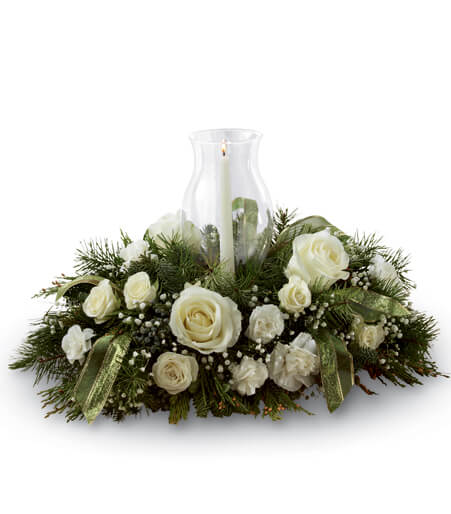 Our Glowing Elegance Centerpiece is a graceful arrangement of all-white flowers, including creamy roses, white carnations and mini carnations, and delicate baby's breath, artfully arranged in a bed of winter greens and verdant leaves. The centerpiece is held in an elegant white crystal hurricane vase, which holds a single white candle. The entire arrangement is tied together with a sheer green satin ribbon, making it a stunning gift for your loved ones or a beautiful addition to your own holiday decor.